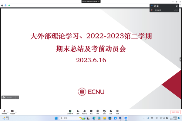 6月16日晚,大学英语教学部利用腾讯会议开展理论学习、期末总结及考前动员。大学英语教学部主任严文庆带领教师们学习了习近平总书记“5.29”重要讲话精神,副主任胡婧详细说明了期末考试安排,大学英语教工党支部书记苏俊玲通报了聘期考核情况、课程团队及第二课堂各工作坊负责人本学期开展工作情况以及本部门教师出国申请相关制度规定等。必赢线路检测3003no1副院长赵朝永做总结发言。全体大学英语教学部教师参加了会议。