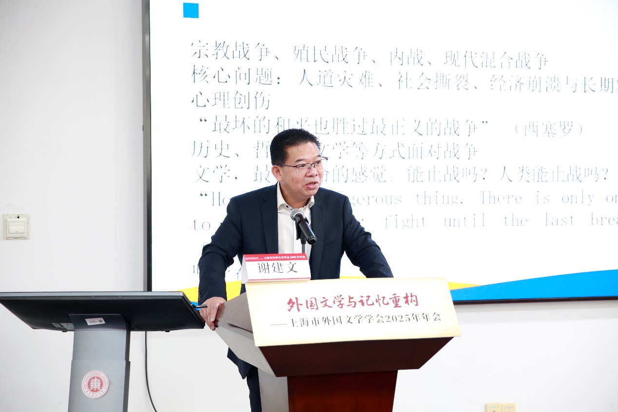 第一阶段的主旨报告由副会长、上海师范大学张静教授和必赢线路检测3003no1胡学星教授主持。副会长、上海外国语大学谢建文教授以《另一个记忆的切口——马塞尔·拜尔<狐蝠>探析》为题,剖析了战争、记忆、声音与文学虚构之间的多重互动关系。谢建文教授认为,拜尔笔下的声音既是记忆的载体,也是重构历史的媒介,“声音档案”不仅再现了帝国末期德国生活轨迹的众声合唱,更在知识诗学的框架下,借助声学、解剖学等跨学科知识,构建了一个兼具身体性、反思性与象征性的叙事空间,最终在真实与虚构的张力中,展现了第三帝国历史记忆的面貌。
