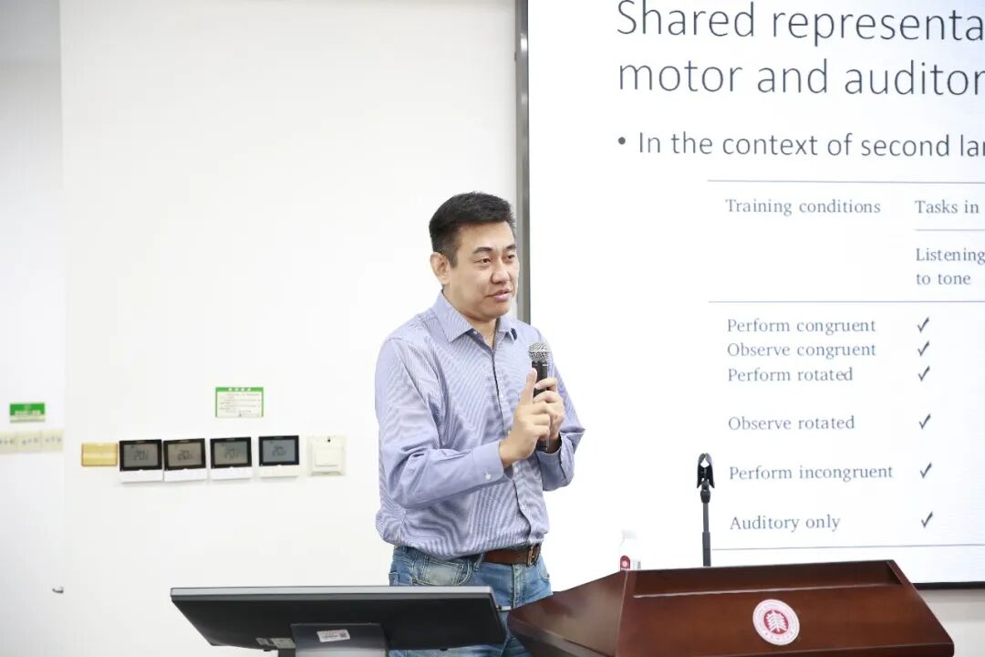 上海纽约大学研究员田兴教授围绕“运动系统在言语学习中的功能”展开主旨报告。围绕言语学习,报告通过三个核心研究佐证运动系统参与认知过程:第一,在二语语音学习中,执行与语音特征(如中文声调方向)相匹配的手势动作,能显著且持久地提升学习效果,证明运动系统可通过形成共同表征来辅助学习。第二,在发音纠错的瞬间学习中,运动补偿效果存在试次间的序列依赖,并受词汇边界等高级认知结构的调节,揭示了运动系统与高级认知系统的交互。第三,在下意识的语音模仿中,脑电证据表明该过程由运动系统主导,而非依赖记忆系统。综上所述,这些发现从不同维度一致证实,言语运动系统绝非被动的输出端,而是与感知、记忆等系统协同,在言语学习中扮演着关键角色,为构建一个运动与感知融合的言语学习框架奠定了坚实基础。