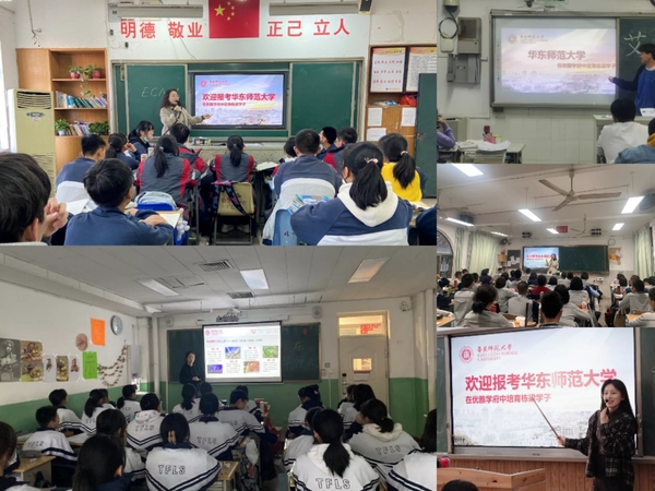 于梦、刘静、蔡相群、宗志英、袁瑛、廖霞漪、孙建锋、张俊和何雯等九位老师是我校其他学科的师范专业毕业生。在宣讲中,他们从我校的平台优势、地理位置、发展脉络、师资力量、校区建设、学科特色、人才培养、团学活动和交流合作等方面介绍了我校的总体情况,并以孟宪承校长“智慧的创获,品行的陶熔、民族和社会的发展”的现代教育理想鼓励同学们将来投身教育事业,在保送生考试时优选报考我校。九位老师还就转专业、辅修专业、毕业生去向、社会实践等回答了同学们的提问。