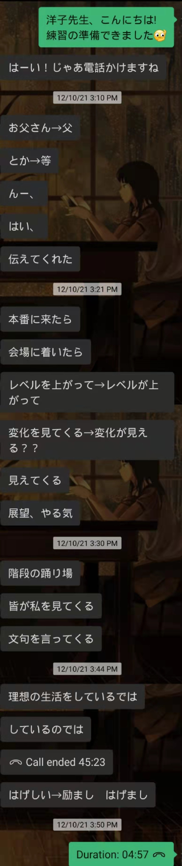 后来得知进入决赛,欢欣鼓舞的同时也开始思考应该如何准备。决赛是3分钟的即兴演讲,由于没有相关经验,比赛章程里对此也没有详细描述,所以我和洋子老师一时没有头绪。考虑到准备时间短,所以只准备了几个简单的题目,之后开始了紧锣密鼓的线上练习——洋子老师读题我答题,之后再由老师点评。期间我也慢慢纠正了一些不好的小习惯以及很多容易出错的基础知识点。