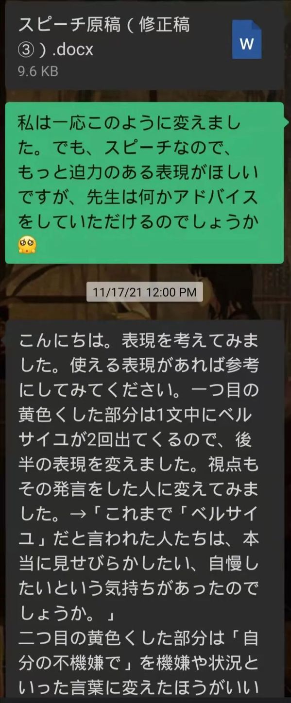 修改稿子的过程漫长而艰难。我先简单写了一篇草稿,反复修改之后发给了洋子老师。洋子老师就内容和语法表达等提出了很多修改意见。在这个过程中碰到了很多困难,比如洋子老师作为日本人不太了解“凡尔赛”这个流行语的用法,需要做很多沟通和解释;再比如我的用词不准的地方需要一个个商量,力求表达更精准,如此来来回回修改了许多次。