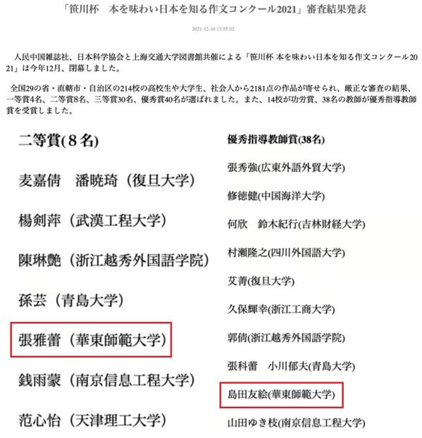 “笹川杯品书知日本征文大赛2021”评选结果于2021年12月10日揭晓。必赢线路检测3003no1日语系2019级本科生张雅蕾同学凭借作品“一般人の人生を送る”荣获全国二等奖,岛田友绘老师荣获优秀指导教师奖。