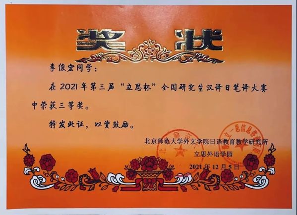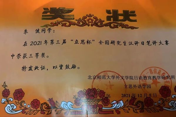 2021年12月5日,由北京师范大学外文学院日语教育教学研究所与立思外语学园联合主办的第三届“立思杯”2021年全国研究生汉译日笔译大赛落下帷幕。日语系2020级研究生朱健同学与2021级研究生李俊宏同学均以出色的表现获得三等奖。