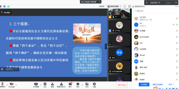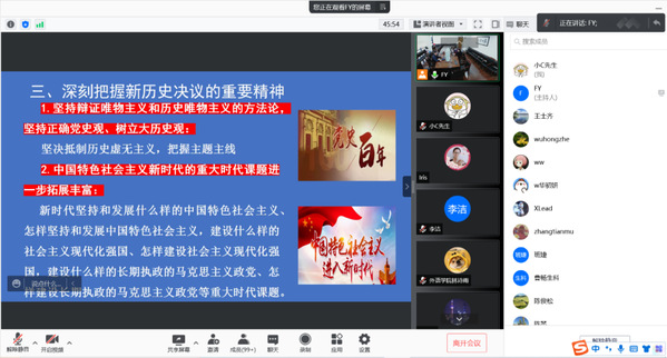 齐卫平教授从深刻认识党的十九届六中全会的重大意义、全面认识党的十九届六中全会和新历史决议的内容、深刻把握新历史决议的重要精神三个层面入手,带领师生系统全面地学习领会党的十九届六中全会精神。