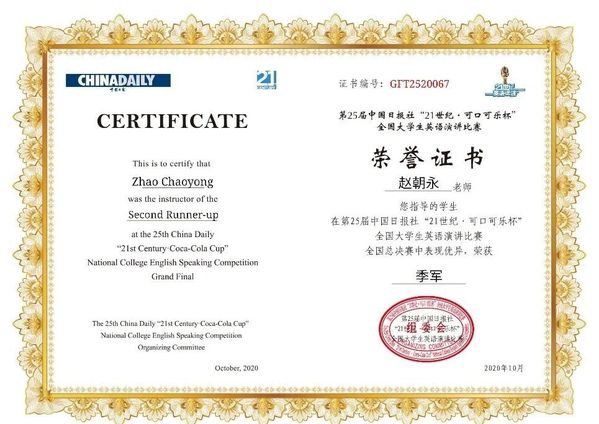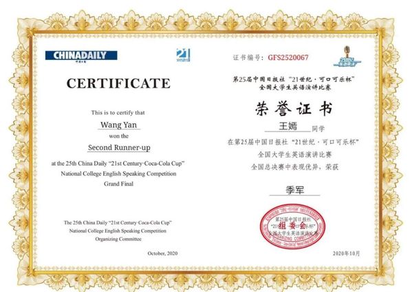 第25届中国日报社“21世纪•可口可乐杯”全国大学生英语演讲比赛半决赛与总决赛于2020年10月5日至8日在广州白云国际会议中心举行,必赢线路检测3003no1大学英语教学部赵朝永副教授带领法学系王嫣同学参赛。在强手如林、竞争异常激烈的总决赛中,王嫣同学再次表现出超凡实力,在半决赛中以第一名的优异成绩出线,并在总决赛中最终获得全国季军佳绩。