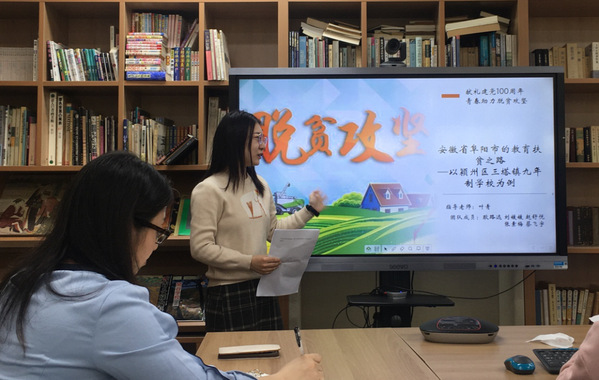 耿路远同学首先分享了暑假开展的教育扶贫项目考察——《安徽省阜阳市的教育扶贫之路——以颍州区三塔镇九年制学校为例》。她和组员从扶贫干部、扶贫老师、贫困家庭父母、贫困学生四个角度分别编写问卷和访谈提纲,并进行实地走访。在走访过程中,她们了解到该校从六年前就开始负责附近两个村的贫困学生,校长办公室还专门设有“精准扶贫专柜”存放贫困学生的资料;当地村支书也积极深化扶贫政策,主动探索教育扶贫的新思路,与学校、家长协同开展教育扶贫。根据调研情况,调研组帮助当地建立了线上成长树洞群,并根据师生需求捐赠了绘本,给予当地学生实质性的帮助。