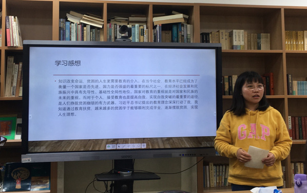 根据活动主题,支部同学们纷纷分享学习感悟。张成成谈起了另她感触颇深的支教经历。知识改变命运,贫困的人生更需要教育的介入。对于个人而言,接受教育是提高自我、实现自我突破的最重要的途径,是人们挣脱贫困枷锁的有力武器。王丽川同学分享的主题是“阻断贫困代际传递,郸城教育扶贫在行动”。近年来,郸城县坚持“扶贫先扶智、治贫先治愚”的思路,以提升教育质量为核心,以促进教育均衡发展为主线,以阻断贫困代际传递为目标,着力抓实控辍保学,实施贫困家庭就学子女精准资助,教育扶贫成效明显。郭舒昱同学谈到她最大的感受是教育对个人、对社会以及对国家的重要性。新时代的学生更应该“提高”自己的精气神,要坚持读原著,学原文,悟原理,提高政治站位。