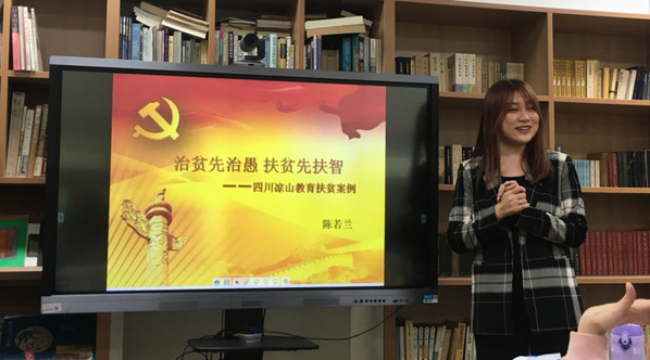 随后,陈若兰同学带领大家学习了四川凉山的教育扶贫案例——“治贫先治愚,扶贫先扶智”。她谈到,在过去的大凉山,失学、辍学成了常态,扶贫必扶智,让贫困地区的孩子们接受良好教育,是扶贫开发的重要任务,也是阻断贫困代际传递的重要途径。张逸闻同学带领大家学习了上海的教育扶贫案例。在多年的对口帮扶中,上海逐渐形成了“民生为本、产业为重、规划为先、人才为要”的工作方针,也开创出一系列从“输血式”转向“造血式”的精准扶贫新举措。