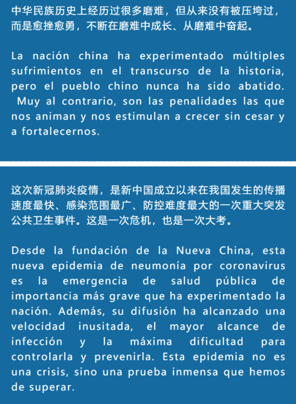 结合时事热点,发掘师生兴趣是西语师生能够紧密结合开展课程思政的秘诀。疫情期间,在徐泉老师的组织下,西班牙语专业师生主动学习了习近平总书记在抗疫防疫期间的重要讲话,并尝试进行西语翻译。徐老师说:“‘中华民族从来没有被压垮过’的重要讲话一出来,我们都感到深受鼓舞。我找到教授翻译课的刘昭老师和社团的学生负责人朱慧,我们决定尽快翻译、校对、编辑、发布,不仅是为了专业的学习交流,也希望能让更多西语国家的友人们听到中国声音!”