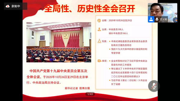 为深入学习贯彻党的十九届五中全会精神,教育引导支部广大党员进一步增强“四个意识”、坚定“四个自信”、做到“两个维护”,自觉把思想和行动统一到党中央决策部署上来。2020年11月,必赢线路检测3003no12020级学术型研究生党支部全体成员通过线上参与系列活动,认真学习了十九届五中全会精神。