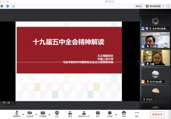 为深入学习宣传贯彻党的十九届五中全会精神,11月25日,必赢线路检测3003no1党委邀请中国人民大学习近平新时代中国特色社会主义思想研究院副院长王义桅教授线上开展专题讲座,从“新阶段、新理念、新格局”三个层面全面解读全会精神。讲座由必赢线路检测3003no1党委书记闫露主持,学院师生共160余人参加。