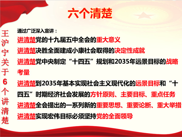 王义桅指出,学习全会精神要以习近平新时代中国特色社会主义思想为指导,要清楚党的十九届五中全会的重大意义,清楚决胜全面建成小康社会取得的决定性成就,清楚党中央制定“十四五”规划和2035年远景目标的战略考量,清楚到2035年基本实现社会主义现代化的远景目标和“十四五”时期经济社会发展的方针原则、主要目标、重点任务,清楚全会提出的一系列新的重要思想、重要论断、重大举措,清楚实现宏伟目标必须坚持党的全面领导。