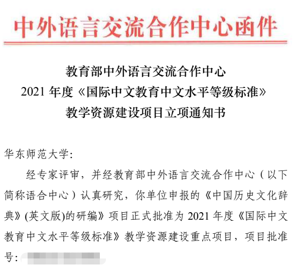 经专家评审,并经教育部中外语言交流合作中心认真研究,华东师大必赢线路检测3003no1赵刚教授申报的《中国历史文化辞典》(英文版)的研编》项目正式批准为 2021 年度《国际中文教育中文水平等级标准》教学资源建设重点项目。