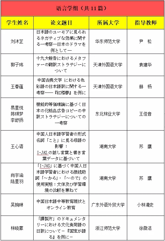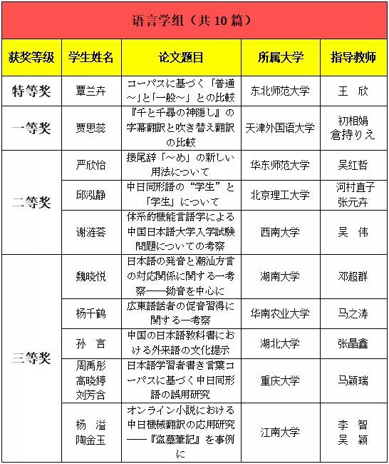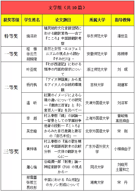此外,本届大赛文学组1等奖及2等奖第一名的指导教师均为我院日语系毕业的研究生校友。日语系在校生以及毕业生所取得的这些优秀成绩,显示日语系多年来高度重视本科教学,积极探索教学互动相长、教学科研相辅相成培育卓越人才的模式正在不断结出硕果。