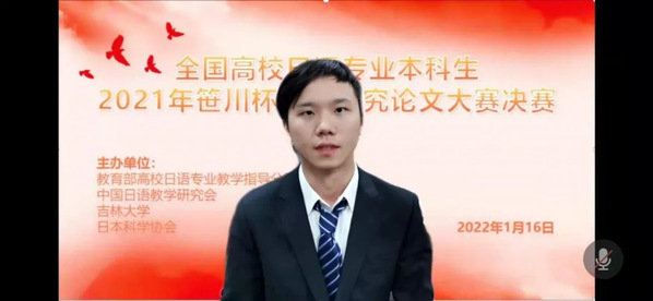 决赛于2022年1月16日在吉林大学隆重举行。由于新冠疫情的影响,本次决赛采用线上答辩的方式进行,由参赛选手发表-评委提问-选手回答三个环节构成;每位选手PPT发表时间15—20分,评委提问选手回答环节10分;选手发表及提问回答均使用日语。最终三组分别评选出特等奖1名、一等奖1名、二等奖3名、三等奖5名,共计30名获奖者。此外还评出语言组11篇、文学组16篇、文化组44篇优秀奖论文。