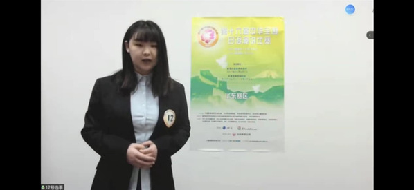 命题演讲环节由选手们提前拍摄好五分钟左右的演讲视频,评委们进行打分。命题共有两个主题可由选手自选:“新冠抗疫给我的启示”、“如果我能穿越时空”。段雪芬同学选择的是“如果我能穿越时空”这个题目,讲述高中时因为一个小误会而造成的与好朋友断交,大学后消除误会并感悟语言沟通的重要性的经历。