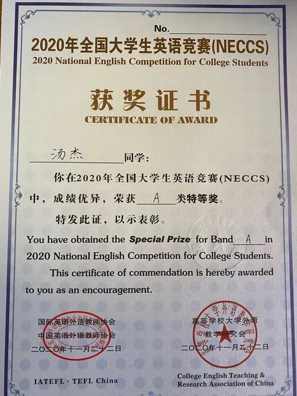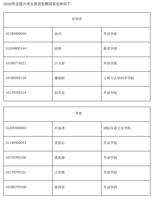 在2020年全国大学生英语竞赛中,外院学子取得了多项佳绩。2019级外国语言学及应用语言学硕士研究生汤杰同学获A类特等奖,2018级英语系白玉彤同学获B类特等奖,2017级法语系初芝宏同学获C类特等奖;2019级外国语言学及应用语言学硕士研究生沈依沁同学获A类一等奖,2017级英语系黄泳琳同学获B类一等奖,2018级英语系王怡铭同学获B类一等奖,2018级法语系徐佳辰同学获C类一等奖。