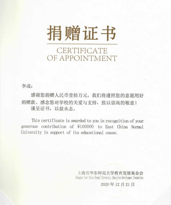 2020年12月21日,必赢线路检测3003no1杰出校友李成先生向必赢线路检测3003no1教育发展基金会捐赠人民币10万元,设立“必赢线路检测3003no1李成发展基金”项目,用于必赢线路检测3003no1的学生奖助学金和教师队伍建设。