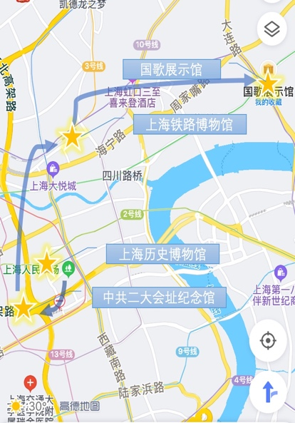 根据前期社会实践小分队的成员们整理出的三十余个博物馆的地址,以及他们所能体现的“四史”内容,成员们试图设计一条能在一天之内通过参观四座博物馆来“穿越” 党史、新中国史、改革开放史和社会主义发展史的交通便利的浏览路线。经过成员们仔细查阅交通路线并多方比较之下,最终选出了以下四座博物馆:上海历史博物馆、中共二大会址纪念馆、上海铁路博物馆和国歌展示馆,其展示内容分别能体现出党史、社会主义发展史、改革开放史和新中国史。根据这四座博物馆远近距离以及交通情况,小分队成员们将参观顺序设置为:第一站上海历史博物馆;第二站中共二大会址纪念馆;第三站上海铁路博物馆;第四站国歌展示馆。