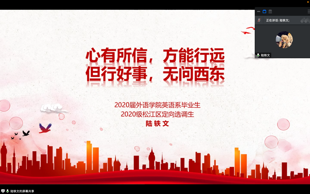 本次会议邀请了2020届英语系毕业生、2020级松江区定向选调生陆轶文以“心有所信,方能行远;但行好事,无问西东”为题为毕业生党员们分享了她在疫情期间的抗疫经历和心得体会。3月初以来,陆轶文作为一名基层工作者,积极投身于抗疫工作一线,协助进行核酸筛查、分发抗原、发放物资、帮助居民配药和外出就医、帮助老年人登记核酸采样信息等工作。随时待命,有召必应,成为了她这段时间以来的工作常态。陆轶文谈到,“心有所信”是指作为共产党员的我们,要始终坚持“动态清零”的总方针,要有必胜的信心和战略定力,思想上与党中央保持高度一致,在行动上有召必应,服从组织安排,才能行稳致远;“但行好事”是指身为共产党员,我们要发挥自己力所能及的力量,去为社会、为身边的人献出自己的一份力,要发光发热,传递正能量,为打赢大上海保卫战作出更大努力。