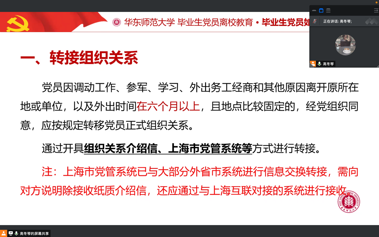 最后,学院党委委员、专职组织员高冬琴详细介绍了毕业生党员转接组织关系的具体要求,并强调及时完成组织关系转接的重要性。她向毕业生党员讲明离校后转移组织关系应该注意什么,应该怎么做,帮助毕业生党员提高思想认识,解决实际问题。她希望毕业生党员坚持以习近平新时代中国特色社会主义思想为指导,尊崇党章、遵守党规,在走上工作岗位后继续发挥好党员的先锋模范作用,报效祖国、服务社会,在实现中国梦的生动实践中放飞青春梦想。