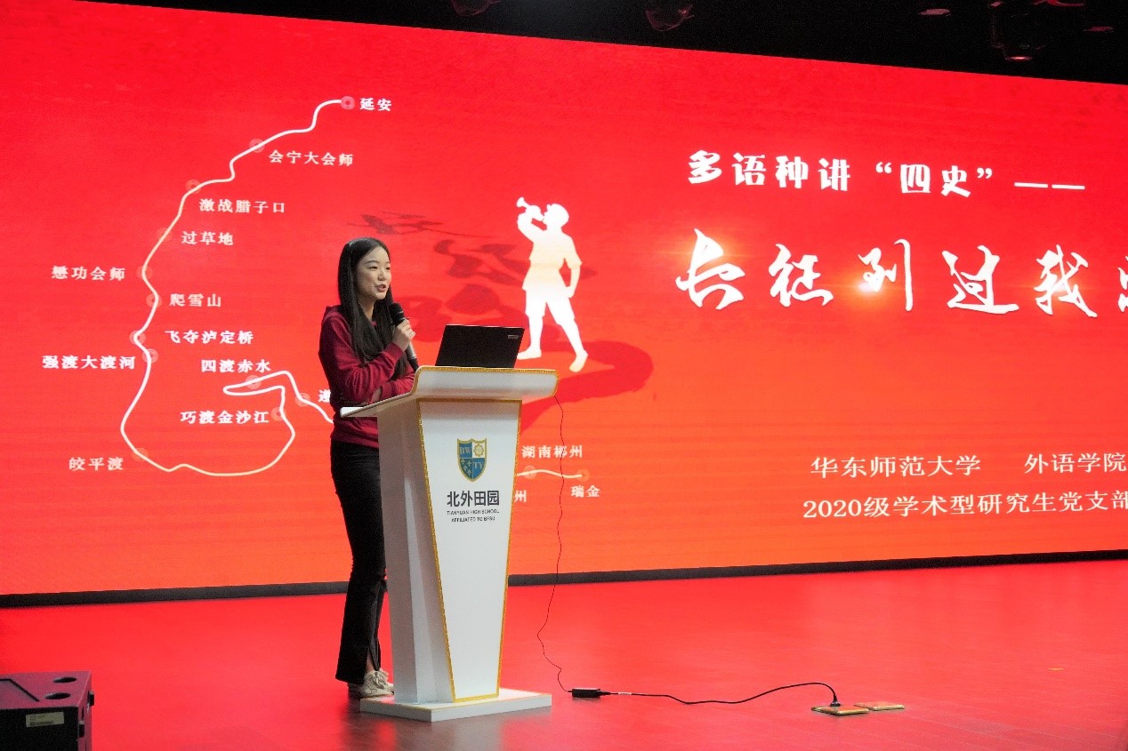 丁惠雅是华东师大必赢线路检测3003no1多语种学生党史宣讲团的一员。这支团队由必赢线路检测3003no12020级学术型研究生党支部党员及本科生联合组成,在学院党委的指导下,团队以专业优势和青春力量学习和发扬党史,让原创多语种党史学习教育资源走进中学。4月16日,宣讲团四名成员在必赢线路检测3003no1党委副书记兼副院长江宇靖,必赢线路检测3003no12020级学术型研究生党支部书记、日语系教师金晶,必赢线路检测3003no1团委书记周俊辰的带领下,走进北京外国语大学附属上海田园高级中学,以“长征到过我家乡”为主题,为选修日语、法语、德语、西班牙语的四个小语种的350余名高一学生讲述长征故事,教授外语专业知识。活动由2020级学术型研究生党支部副书记李梦婕主持,田园高中校长陆振权、教学发展中心主任屠文娟对宣讲团一行的到来表示热烈欢迎。