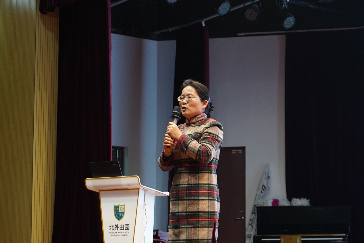 在田园高中观礼堂里,四名宣讲团成员分别讲述了红军长征经过自己家乡的故事,并用所学外语教授了红军长征相关词句的表达。日语专业的邓楚涵同学分享了家乡湖南省郴州市的“半条被子”与“第一军规”的故事,展现了党同人民风雨同舟、血脉相通、生死与共的鱼水深情,并通过详细介绍“三大纪律八项注意”的内容,讲解日语基础词汇。他动情地说:“半条被子,象征着共产党人的初心,也象征着我的故乡与长征、与红军的不解之缘。希望同学们可以坚定理想、勇敢追梦,大志を抱け(胸怀大志)!”德语专业的陈瑶同学结合红军长征粤北纪念馆的展览讲述了红五军团和红十四军团在广东连州如何奋勇抗敌成功突围的故事,详细讲述了“星星之火,可以燎原”的德语表达(Aus einem Funken kann ein Steppenbrand entstehen),并以“Viel Glück und Erfolg beim Deutschlernen!(学有所乐,学有所成!)”鼓励同学们保持乐观积极向上的精神风貌。西班牙语专业叶超楠同学结合甘肃省腊子口纪念馆的相关图片史料,讲述了军事史上以弱胜强、出奇制胜的腊子口战役,并与“新冠病毒的战役(batalla contra el coronavirus)”联系起来,讲述长征精神在当代的传承和发扬,以“No juzgues cada día por lo que cosechas sino por las semillas que plantas.(不要用收获了什么来衡量你的一天,而是播种了多少)”鼓励大家要勤学善思、勇敢前行。法语专业的丁惠雅同学讲述了中央红军到达长征结束地陕北吴起镇的故事,生动描画了当地百姓张宪杰与红军战士之间的鱼水情深,和大家一起领略了革命先辈的战略智慧,以“Le vent se lève, il faut tenter de vivre.(纵有疾风起,人生不言弃。)”鼓励同学们面对困境永不言弃。