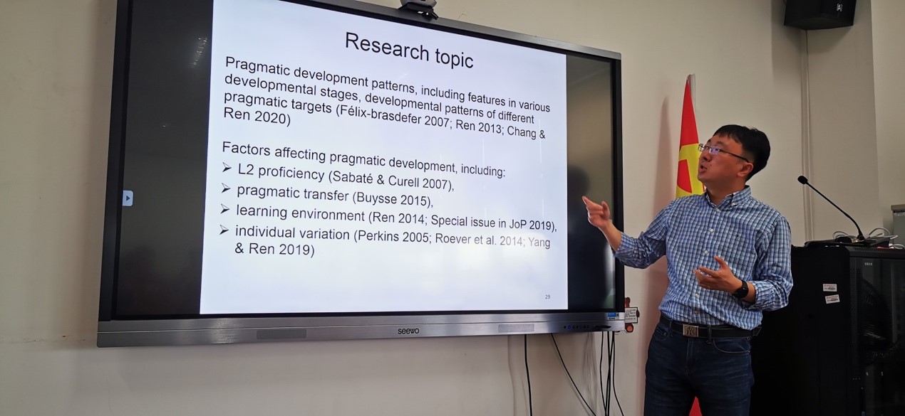 随后,任伟教授表示,语用能力研究已经得到二语习得研究者的重视。他从语用能力出发,提出语用能力分为社会语用能力与语用语言能力。社会语用能力指学习者受社会距离、社会地位等语境因素影响,选择合适的语言表达方式来实施言外之力;而语用语言能力则指学习者如何在具体语境中有效地使用语言达成交际目的。任教授指出,研究时既要关注学习者的语言产出,又不能忽视其对语言的理解。