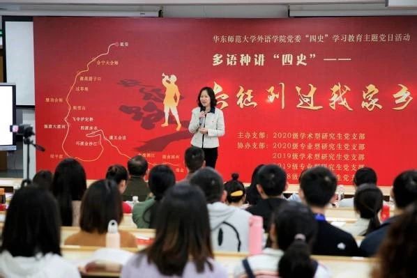 2020年10月,支部开展“多语种讲四史——长征到过我家乡”党日活动。来自英语、日语、法语、德语、俄语、西班牙语六个专业的学生党员用六种语言讲述红军长征经过自己家乡的故事,该活动被上海市教卫党建网报道并入选2020年校优秀主题党日活动案例。在此基础上,为进一步积极探索“大中小”思政课一体化,扩大党史教育影响力,支部成立“多语种讲党史”宣讲团,在2021年4月和6月分别前往北京外国语大学附属田园高级中学和上海外国语大学尚阳外国语学校,开展“多语种长征故事”宣讲教育活动,践行用外语讲好中国故事,不断为新时代红色文化传承贡献力量。该活动得到“第一教育”“央广网”等媒体报道。