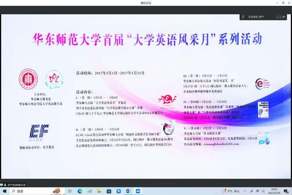 严文庆介绍了学校卓越课程培养方案,包括先修课程、分级考试、听说与读写卓越课程建设、水平测试、选修课和微专业建设。严老师进一步通报了绩效考核、年度考核和科研考核要求,提前部署了拟于5月份举办的华东师大“大学英语风采月”系列活动。