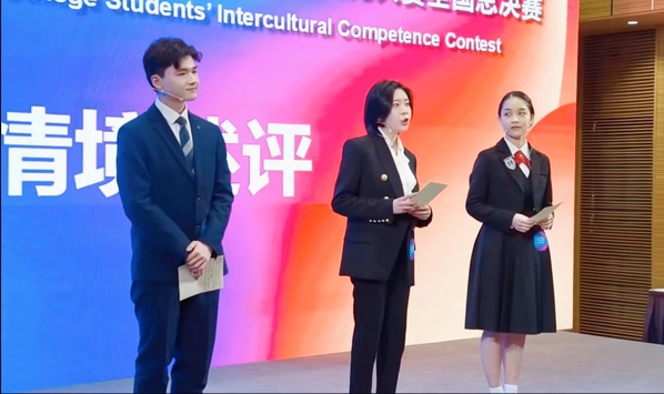 在26日的全国总决赛中,我校学生团队以自信从容的姿态,再次站上了熟悉的赛台。总决赛全为即兴考察,对选手的临场反应能力,英语表达能力、知识储备等各方面的要求相较于决赛都要更高,竞争也更为激烈。面对重重挑战,我校学生团队迎难而上,从文化协同、文化语境、文化误译等维度出发分析实例,凭借优异的语言能力、创新能力和默契的合作精神,出色地完成了快问快答、即兴案例评述与讲述中国故事的全部环节,获得了评委嘉宾的一致好评。在总决赛中,我校团队在13支优秀的参赛队伍中脱颖而出,获得了90.42的全场最高分。最终,我校学生团队以89.94的综合得分成功实现逆袭,斩获全国特等奖季军的优异成绩。李辉和金怡老师两位老师荣获特等奖季军指导教师奖。