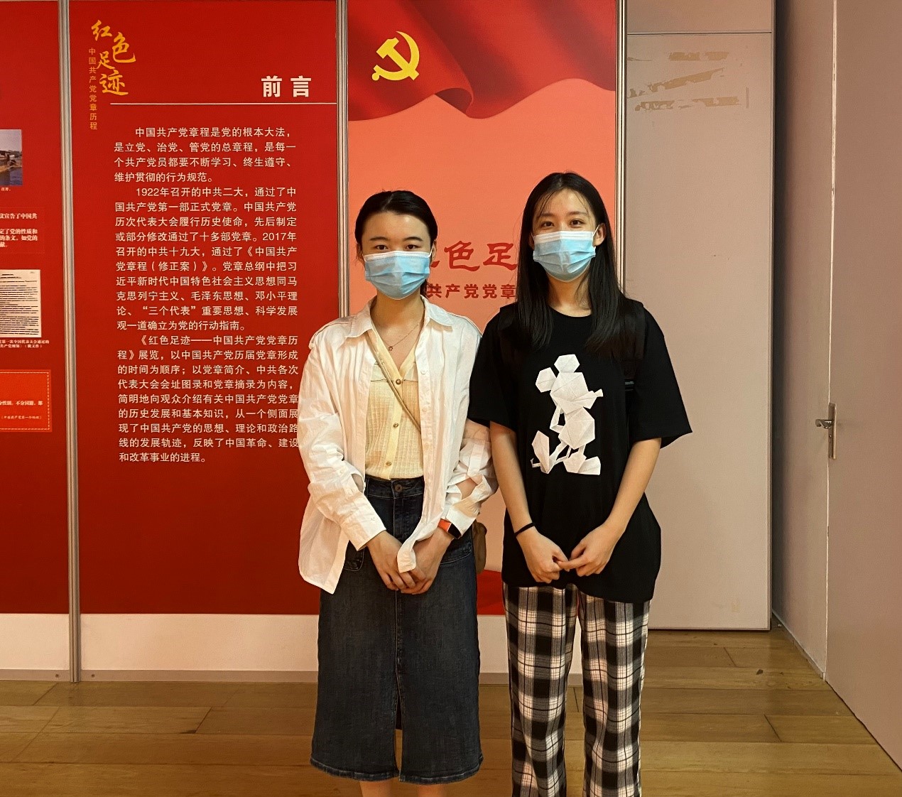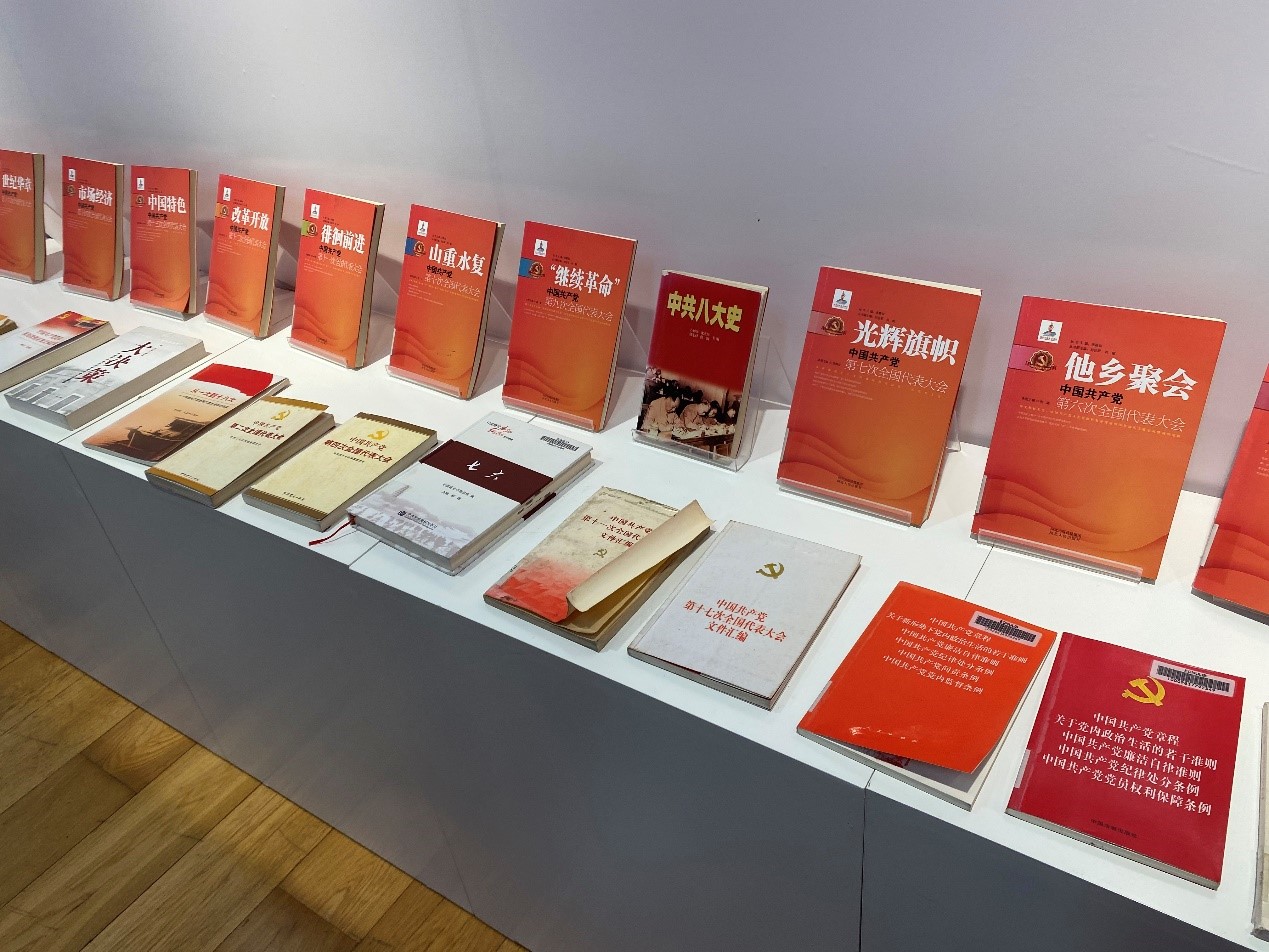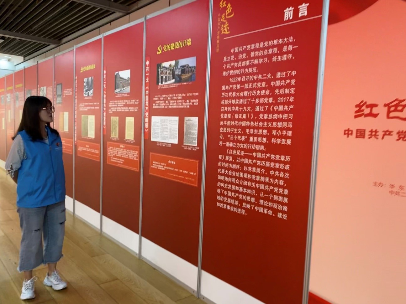 走进图书馆,入眼便是一块鲜红的写着“红色足迹——中国共产党党章历程展”的主题海报,庄严中蕴藏着历史的厚重。走入展馆,志愿者同学为支部党员介绍一幅幅展板的内容。从中共一大通过《中国共产党纲领》,到中共二大第一部正式党章的问世,中国共产党历次代表大会履行历史使命,先后制定或部分修正通过了十多部党章,到如今,已是2017年中共十九大通过的《中国共产党章程(修正案)》。在这100年间,抗日战争胜利、新中国成立、改革开放、港澳回归、全面脱贫、北京冬奥会举办,中华民族历经磨难,在中国共产党的领导下,发展日新月异,人民生活持续改善。而中国共产党党章同中华民族一起,见证着所有的磨难与成功,也将见证十月召开的党的二十大。