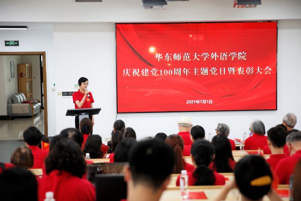 在庄严的国歌声中,大会拉开帷幕。本次表彰大会以“学党史、悟思想”“办实事、开新局”“传承、致敬”三个篇章回首中国共产党百年奋斗路、启航时代新征程,融合外语学科特色汇报展示各党支部风采和实践成果,礼赞建党百年。