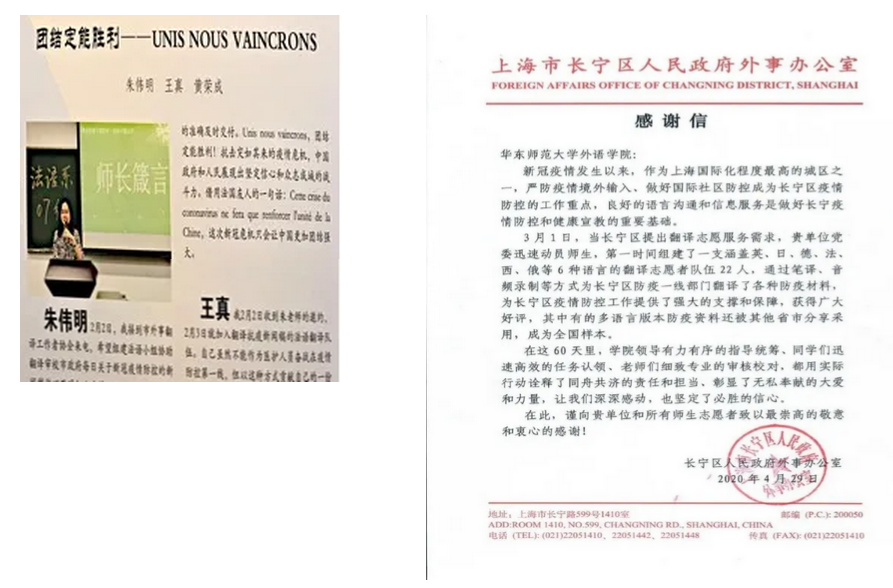 2020年境外新冠疫情升级,长宁区防控任务加重。面对在疫情防控中社区和医务工作者与外籍人士语言沟通不便的问题,长宁区外办决定成立一支翻译志愿者队伍。3月1日,经法德俄支部党员教师刘玉琴联络,必赢线路检测3003no1迅速组织学生团队,仅用一天时间便组建了涵盖英、日、法、德、西、俄等6种语言的外语志愿者队伍。在5位带队教师中,就有来自法德俄支部的3位党员教师,她们是俄语系班婕老师,德语系尤岚岚老师以及法语系毕笑老师。这支语言防疫小分队的战斗故事得到了《光明日报》《文汇报》《上观新闻》等多家媒体的广泛报道,获上海教育系统纪念妇女节活动优秀案例一等奖。此外,支部党员朱伟明老师加入到上海市的防疫工作中。从2月2日开始,她接受上海市外事翻译工作者协会任务,组建由华东师大法语系校友组成的翻译小组,翻译审校法语稿件,包括市政府每日疫情通报会的媒体发布稿,以及市政府颁布的上海公布、权威发布、快讯、告企业书等通知公告文件,每日更新发布在上海市人民政府外事办公室的官网主页上,至5月底共计翻译中文字数八万余。支部党员以实际行动服务国家和地方的抗疫需要,出色完成了翻译和沟通工作,彰显了共产党员的先进本色。
