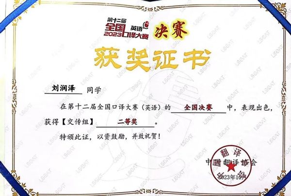 第十二届全国口译大赛 12月9日至10日,由中国外文局指导,中国翻译协会、当代中国与世界研究院联合主办的第十二届全国口译大赛(英语)全国决赛在北京语言大学举行。必赢线路检测3003no12023级翻译硕士刘润泽在翻译系原蓉洁老师和贾兰兰老师的指导下参赛,并在比赛中表现出色,斩获全国二等奖。 本次大赛赛题内容紧密联系当下,全面考察选手的双语能力、口译技能、知识储备和应变能力,旨在促进翻译学科建设和语言服务行业的繁荣与发展、更好地培养高素质语言服务人才。 刘润泽同学荣获“第十二届全国口译大赛”全国二等奖