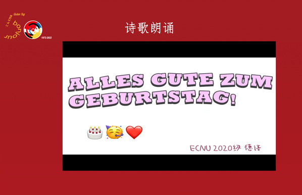 德语系的同学们也通过表演节目的形式为德语专业送上生日的祝福。2020级的同学表演了诗朗诵《An den Mond》,以饱含深情的语调朗诵歌德的这首小诗,并通过一张张照片展示了两年来在华师大学习德语的点点滴滴,为德语专业献上最真挚的祝福“ Alles Gute zum Geburtstag!(生日快乐)”。