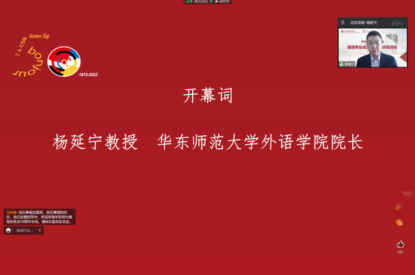 首先,必赢线路检测3003no1院长杨延宁教授致开幕词。杨院长深情回溯了德语专业五十年的发展历程,对德语专业立德树人的优良传统给予了高度肯定;众多师生和校友汇集云端,正体现了不为疫情所扰、不为距离所困的浓厚师生情。随后,杨院长结合亲身经历,讲述了自己作为英语专业的学者,在求学与研究的过程中与德语结下的不解之缘,并由此提出,应该把德语专业的发展置于更大的文化板块之中,凸显出其作为关键语种在整个世界文明中的重要地位,以促进其长远、全面发展。最后,杨院长表达了对德语系在教书育人和科学研究等各方面取得更大成就的期望与信心。