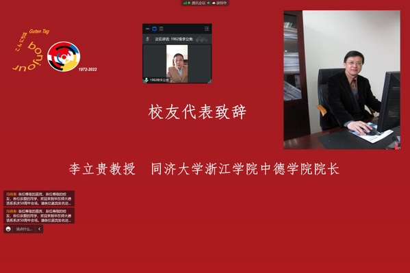 华东师大德语系82级校友,现同济大学浙江学院中德学院院长李立贵教授出席活动并致贺词。李立贵教授首先表达了因为疫情不能回到母校校园的遗憾,并代表校友向母校表达崇高的敬意和感激。他深情回忆母校的一草一木、亭台楼阁,漫步丽娃河畔的美好远远胜过当时生活和学习条件的艰苦,并寄语德语系同学们,要明确人生目标,永不满足地向前。最后,他为大家送上了美好的祝愿:祝德语系的同学身心健康、扎实德语基础,成为具有创造力、想象力、有家国情怀和国际视野的人才;祝母校学科建设、人才培养方面向百尺竿头更进一步;祝德语系老师身体健康、工作顺利、阖家欢乐、万事如意。