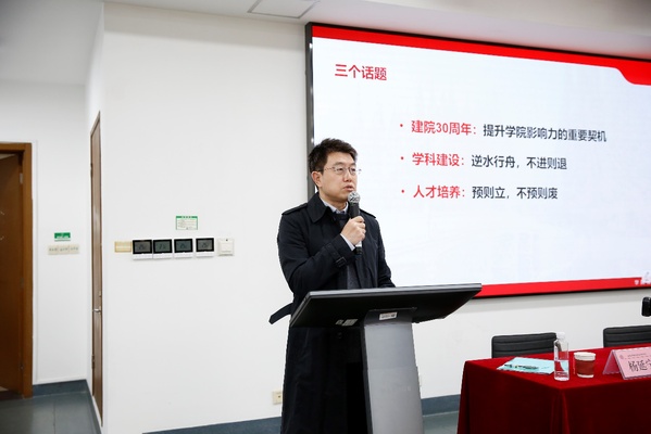 院长兼党委副书记杨延宁指出,今年是学院建院30周年,三十而立,卓越启航,这既是学院凝心聚力共创未来的新起点,也是提升学院影响力的重要契机。围绕30周年院庆,学院将通过系列学术、文化活动,不断推进专业建设和综合改革,改善学院整体环境,提振学科影响力。在学科建设方面,要充分瞄准学院各重点建设领域的发展方向,稳住脚步、用心作为、久久为功,推动学院事业取得新的进步。在人才培养方面,要加强教学项目培育、创新培育模式,通过以赛促学、以学促行,提升学生综合素质,促进学生全面发展。