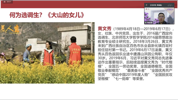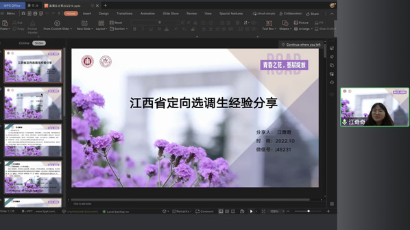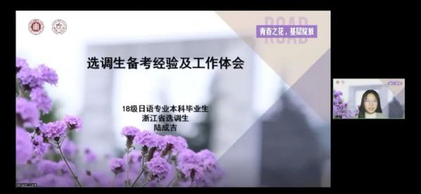 为引导学生服务基层、建功新时代,必赢线路检测3003no1于10月27日举办“青春之花,基层绽放”选调生政策解读与经验分享活动,邀请校学(研)工部副部长、选调生办公室副主任章晶晶剖析解读选调生政策,以及两位选调生校友江奇奇、陆成吉分享第一手的备考经验与基层工作感受,为有志于投身基层、奋斗青春的青年们拨开重重迷雾,坚定前进的方向,照亮脚下的路。必赢线路检测3003no1党委副书记兼副院长江宇靖线上参与,学院团委书记曹安琦主持分享会。