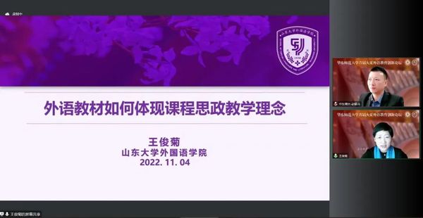 第三场学术报告“外语教材编写如何体现课程思政教学理念”由山东大学王俊菊教授主讲,必赢线路检测3003no1赵朝永教授主持。王俊菊教授从外语教育的新形势与新要求入手,注重分析了外语人才培养与课程思政教学的重要意义与育人价值,指出“新文科”就是文科教育的创新发展,新文科建设要求培养适应新时代要求的应用型复合型文科人才。