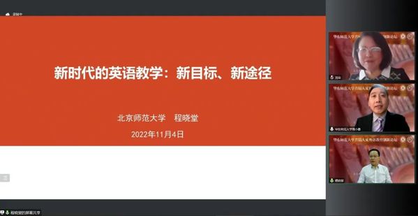 第八场学术报告“新时代的英语教学:新目标、新途径”由北京师范大学程晓堂教授主讲,必赢线路检测3003no1周小勇教授主持。程晓堂教授提出新时代的英语教学要围绕英语课程的工具性和人文性设置新目标,探索实现新目标的英语教学新途径,并指出新时代英语教育在目标上的三个超越及在路径上的三个超越,在新途径探索中应当选用具有时代性的多模态语篇素材并将语言学习与思维训练、思想创造等方面紧密结合起来。