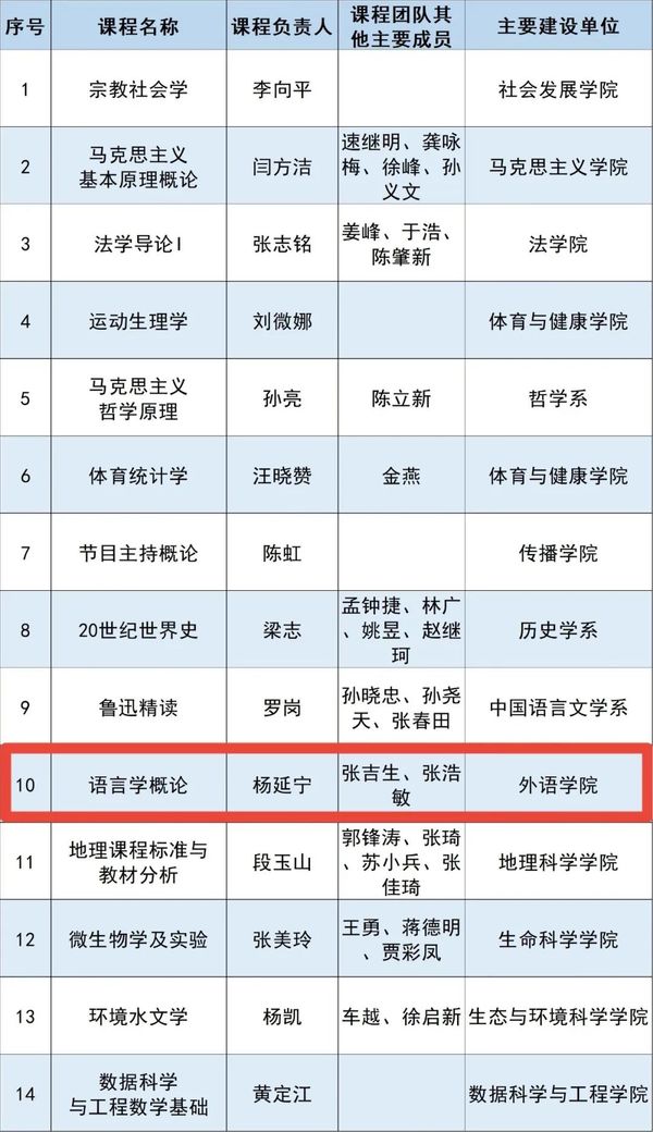 日前,教育部公示了第二批国家级一流本科课程认定结果,必赢线路检测3003no1入选42门。其中,由我院杨延宁教授领衔、张吉生、张浩敏教授加入课程团队的《语言学概论》入选国家级一流本科课程(线下一流课程)。