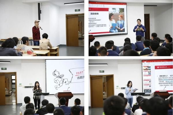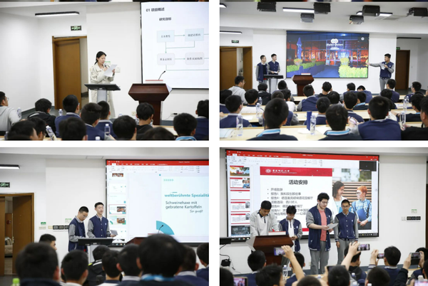 在展示环节,两校学生进行了4场关于德国饮食文化与大学科创项目的报告。在互动环节,我院德语专业播放了去年戏剧节《四川好人》选段,中学生则为全体来宾献上一首德语翻唱版《海阔天空》。随后的分组活动环节中,大学生与中学生组队参观闵行校区,并就学习生活、校园文化、科研项目及未来规划等方面展开讨论。