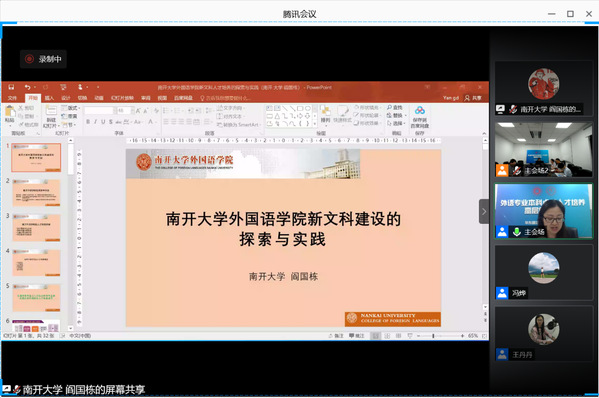 南开大学外国语学院院长阎国栋教授以“南开大学外国语学院新文科人才培养的探索与实践”为题,阐述了南开大学外语学科在新文科背景下的使命、任务和人才培养目标,介绍了南开大学非通用语专业与人文社会科学专业复合型双学位国际化人才培养项目,分享了南开大学外语学科统筹全校教学资源、培养融通人才,以破解人才供需的结构性矛盾的探索与实践。