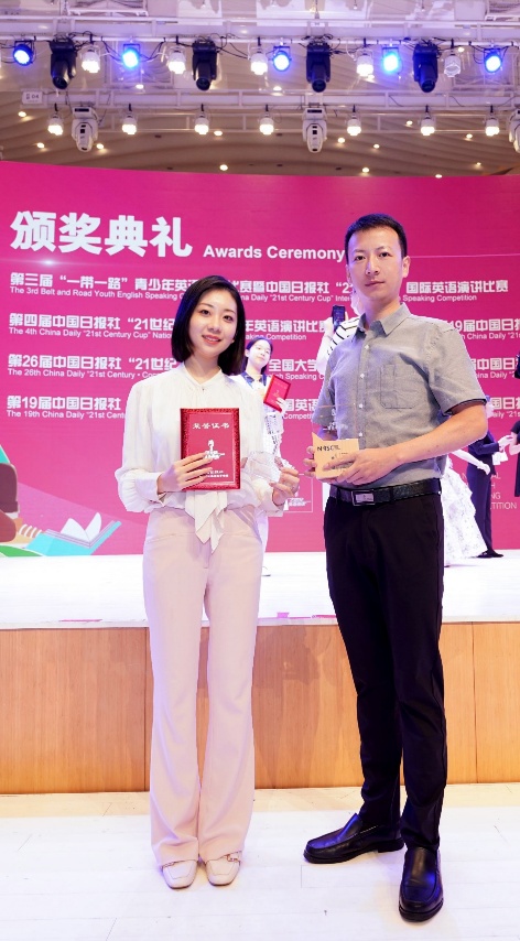 第26届中国日报社“21世纪•可口可乐杯”全国大学生英语演讲比赛半决赛与总决赛于2021年10月3日至6日在成都市欧洲国际会议中心举行,必赢线路检测3003no1大学英语教学部赵朝永教授带领新闻学专业2019级本科生罗颖同学参赛。全国决赛共有来自各个省级赛区的75名选手,可谓高手如林、竞争激烈。经过5天、两轮的激烈比拼,罗颖同学表现出超凡实力,最终获得全国季军佳绩。