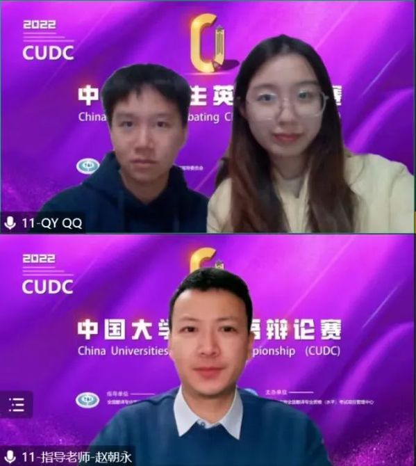 2022年12月3日4日,2022年中国大学生英语辩论赛CUDC全国决赛通过线上方式顺利举行。今年的比赛分为华东、华南、华北、华西4个大区,共分为校选赛、大区赛和总决赛,共有超过500所高校参加,参赛人数超过20万人次。我校选手以华东赛区二等奖的等次晋级决赛。比赛为期两天,200余名选手经过了5轮激烈的比拼。最终,在赵朝永教授的指导下,我校代表队选手祁芊芊(2020级翻译专业本科生)和邱雨桐(2020级英语师范专业本科生)取得全国二等奖。