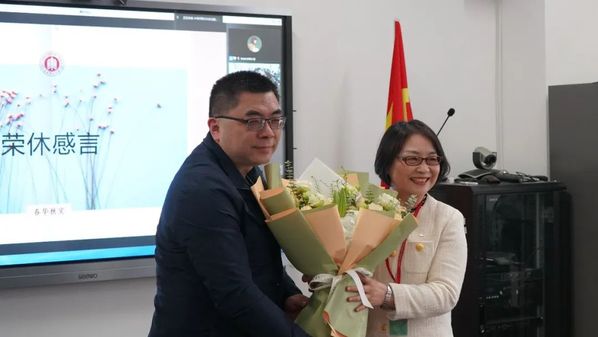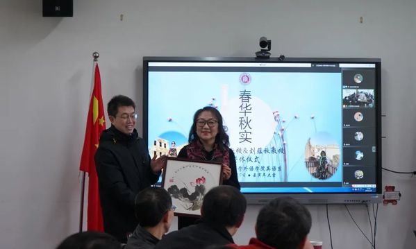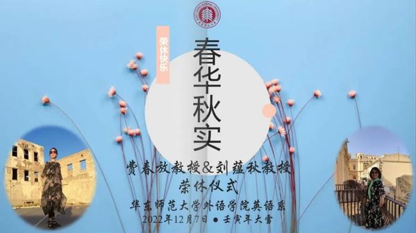 荣休仪式的最后,陈俊松老师用“三尺讲台挥洒汗水永葆本色,万里海外推介中华不忘初心”概况了两位教授的贡献和成就。英语系隆重举行费春放、刘蕴秋两位教授的荣休仪式,既是为了充分肯定两位教师为学校的人才培养以及在海外推广中国文化所做的重要贡献,也是为了弘扬了尊师重教的良好风尚,更是为了勉励青年教师赓续奋斗,推动英语系各项事业的可持续性发展。祝费老师青春永驻,风采依然;祝刘老师幸福安康,桃李满园。也恳请两位老师一如既往地为英语系的事业发展献计献策,关心青年教师、青年学生的成长。有空常回家看看!