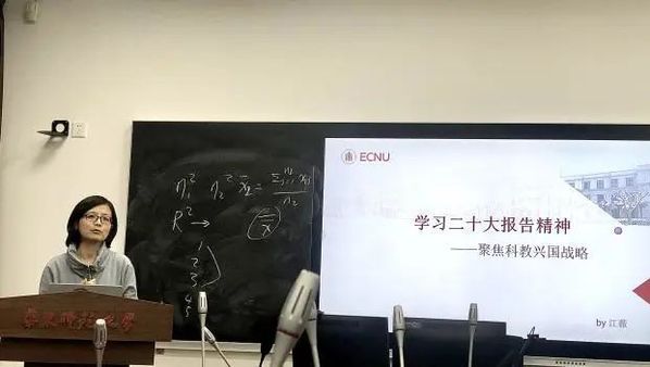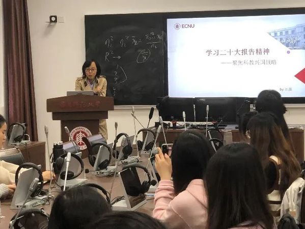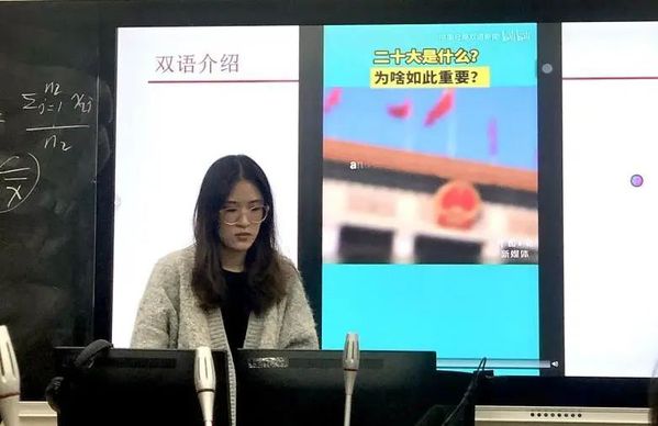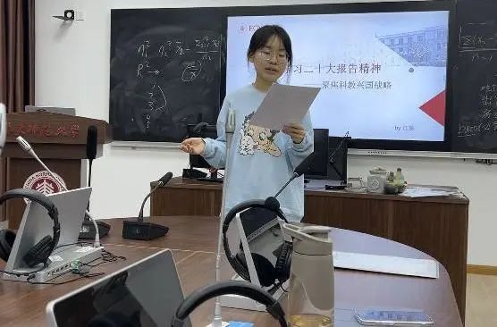 首先,支部党员江薇同志利用中英双语视频为大家讲解了二十大报告的内容及重要概念的翻译,对 “科技兴国、人才强国”战略进行详细分析,并提出了“作为外语/翻译专业的学生,我们如何参与和推动国家的科教兴国、人才强国战略”这一问题,引发了支部党员的思考。